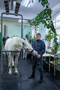 В ветеринарном лазарете гости узнали о специфике поддержания здоровья животных. В ветеринарной службе полка трудятся 11 специалистов. Четверо из них посменно дежурят в подразделении круглые сутки. Кроме стационарной базы в округах имеются ещё несколько кавалерийских рот, в которых есть от 18 до 26 служебных лошадей. Лошади для полка приобретаются в возрасте от 3 до 5 лет. Это самый подходящий возраст для начала их обучения, которое длится свыше двух лет. Животные служат до 20-летнего возраста, после чего их жизнь продолжается уже, что называется, на пенсии.