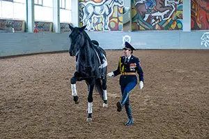 В манеже полицейские-кавалеристы продемонстрировали своё профессиональное мастерство в конно-строевой подготовке. А сотрудники группы оперативно-тактического назначения показали элементы тренировок по обращению с оружием, передвижения, смены позиций, а также обезоруживание противника и приёмы рукопашного боя.