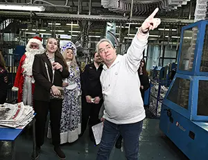 В конце линии Деда Мороза, Снегурочку и полицейских ждало самое волшебное зрелище. Сложенные газеты, одна за другой, летели по транспортёру прямо в руки робота-укладчика. Он с нечеловеческой точностью собирал их в ровные стопки и оборачивал в плёнку.