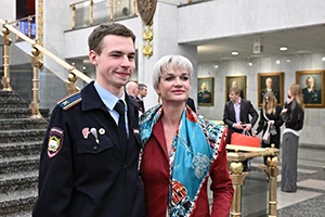 И наконец для вручения памятных наград на сцену поднялась заслуженный мастер спорта России Светлана Хоркина. Она, в частности, выразила особую благодарность жёнам и мужьям награждаемых полицейских за их терпение, любовь и веру в своих близких. Чести поздравления от 2-кратной олимпийской чемпионки удостоились майоры полиции Андрей Кудашов (УВД по ЗАО), Вячеслав Моравский (УГИБДД), Иван Рыбин (УВД по ЦАО), капитаны полиции Николай Кольцов (УГИБДД), Юрий Парадо (УГИБДД), Денис Скоробогатов (УВД по СЗАО), старшие лейтенанты полиции Николай Клычков (УВД по ЮЗАО), Пётр Булеков (УВД по СЗАО) и прапорщик полиции Фёдор Козлов (УВД на Московском метрополитене).