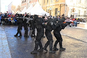 Часть улицы превратилась в импровизированную сцену. Здесь перед зрителями выступали артисты Культурного центра главка столичной полиции, а также демонстрировали профессиональное мастерство и самодеятельное вокальное творчество сотрудники 1-го и 2-го специальных полков полиции ГУ МВД России по г. Москве.