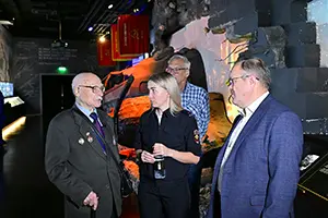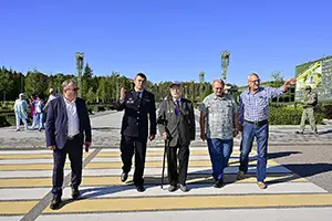 Основная часть экскурсии прошла в музейном комплексе «Дорога памяти», где представлена подробная экспозиция каждого дня Великой Отечественной войны. Протяжённость комплекса, символизирующая все дни и ночи кровопролитных сражений, составляет 1418 шагов. Экспозиция размещена в 35 тематических залах, 26 из которых — это иммерсивные зоны с полным погружением. Благодаря современным технологиям здесь воссоздана обстановка самых значимых этапов войны. Особое внимание ветерана и сопровождавших его привлекли интерактивные панели в галереях, с помощью которых можно найти информацию о любом участнике Великой Отечественной, её героях и всех, кто внёс свой вклад в нашу Победу.